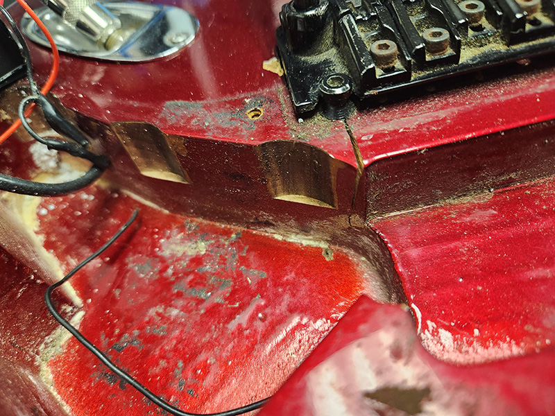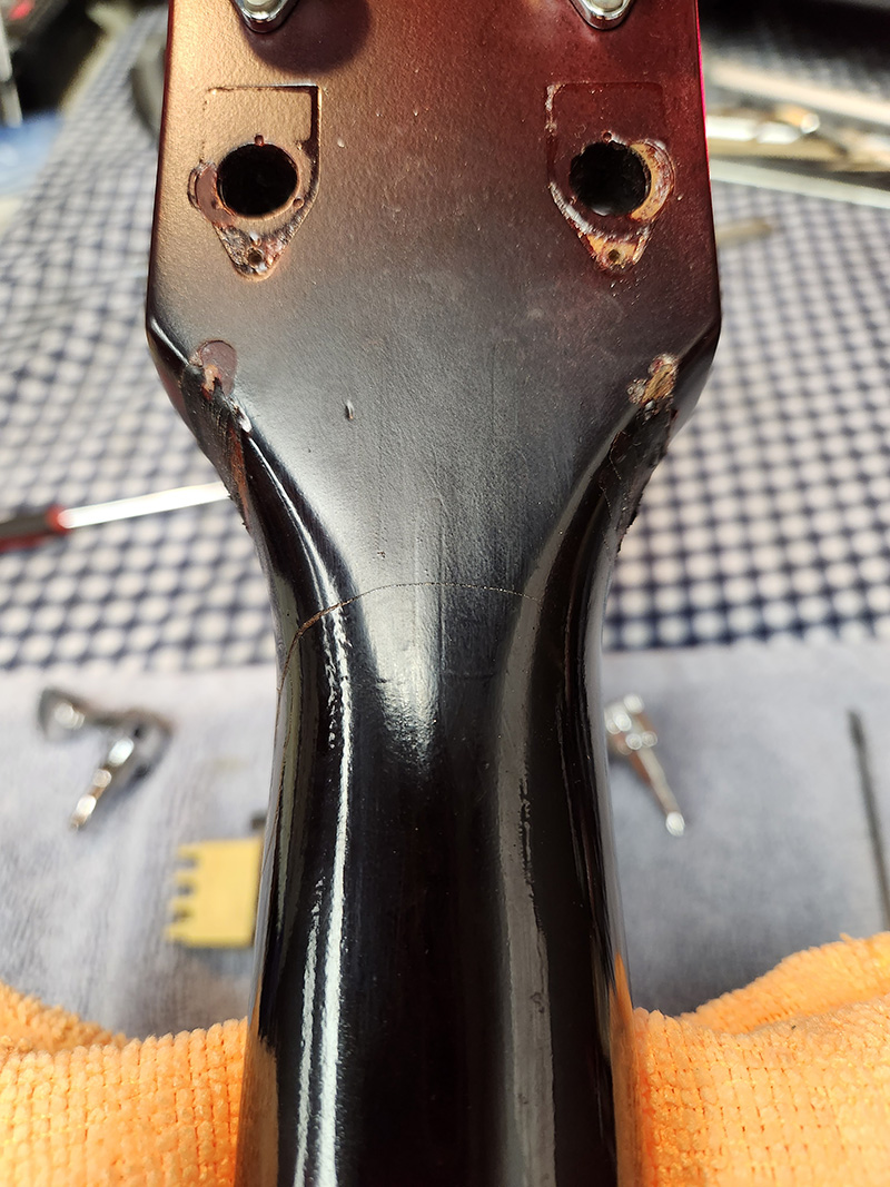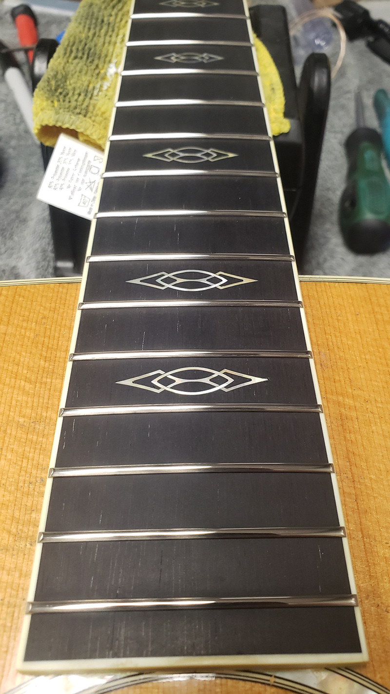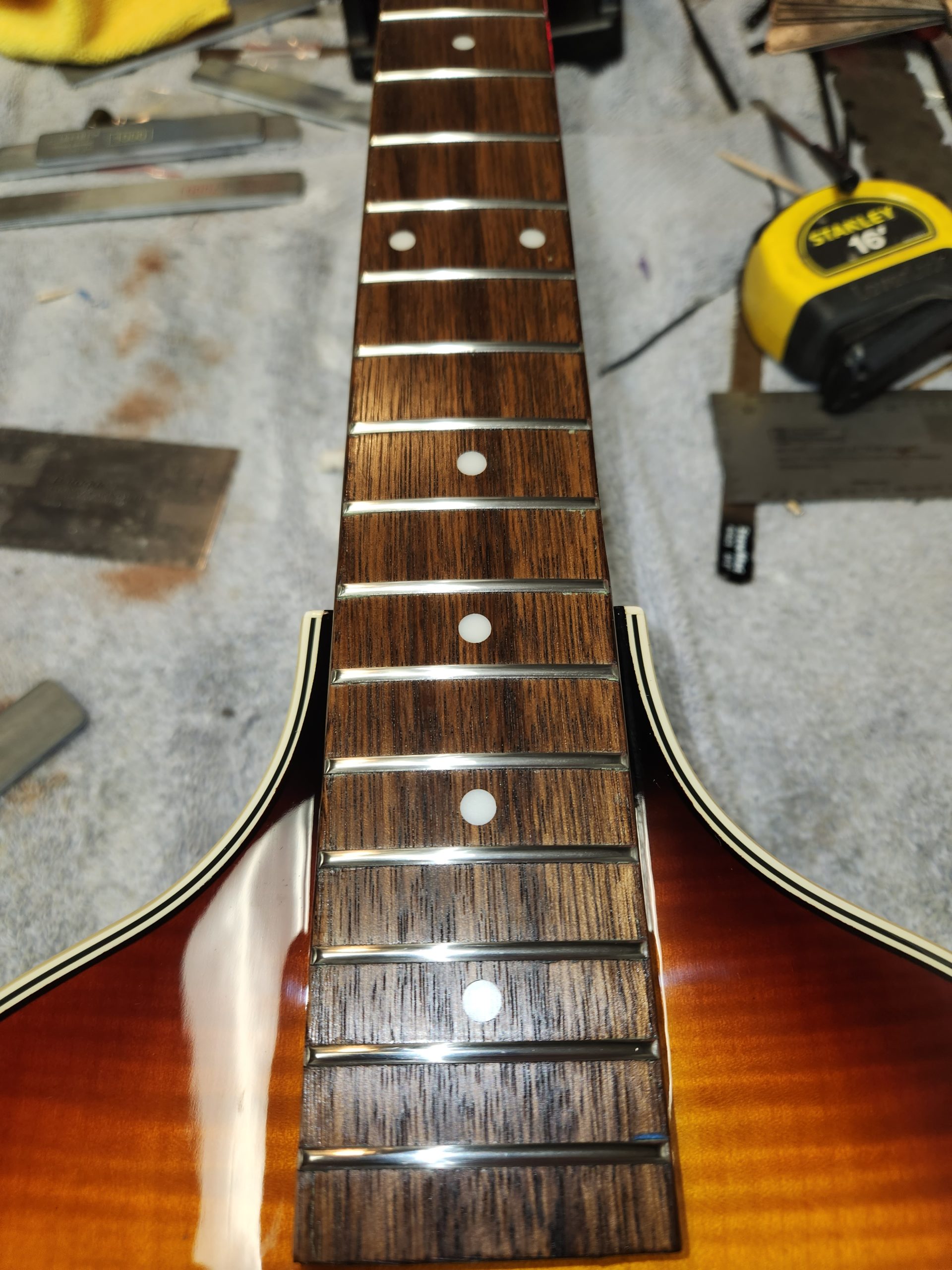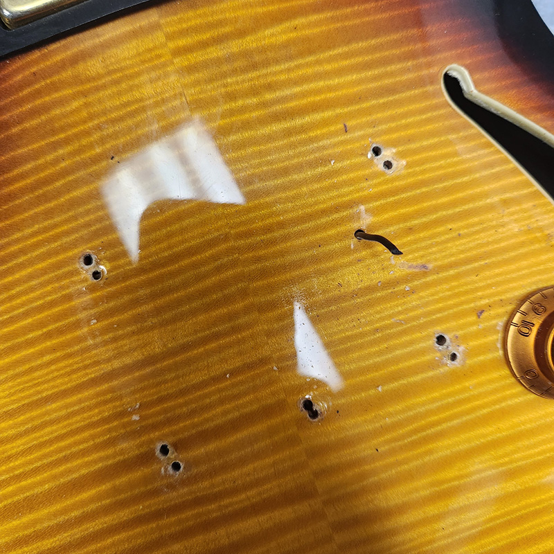 We work on every component of your guitar: necks, fretboard, frets, nuts, saddles, bridge, headstock repair, tuners, electronics, body damage, structural bracing, neck reset, binding, nitrocellulose and poly finishes, oil finishes, and fretless bass.