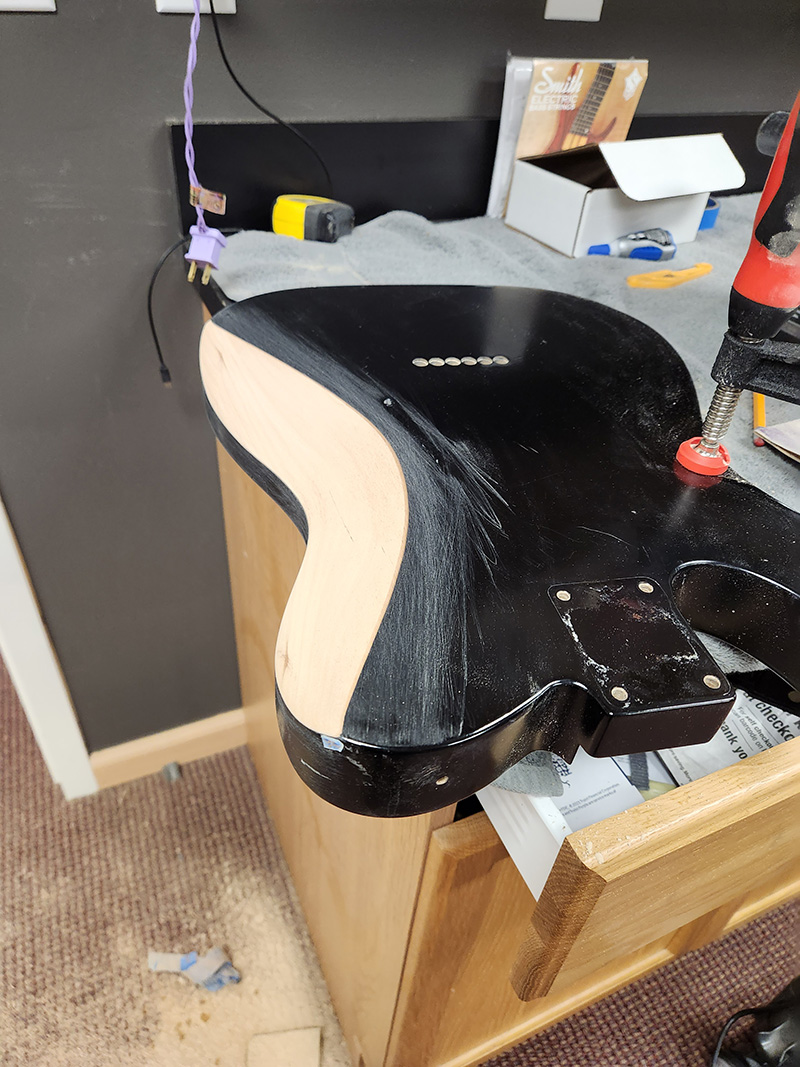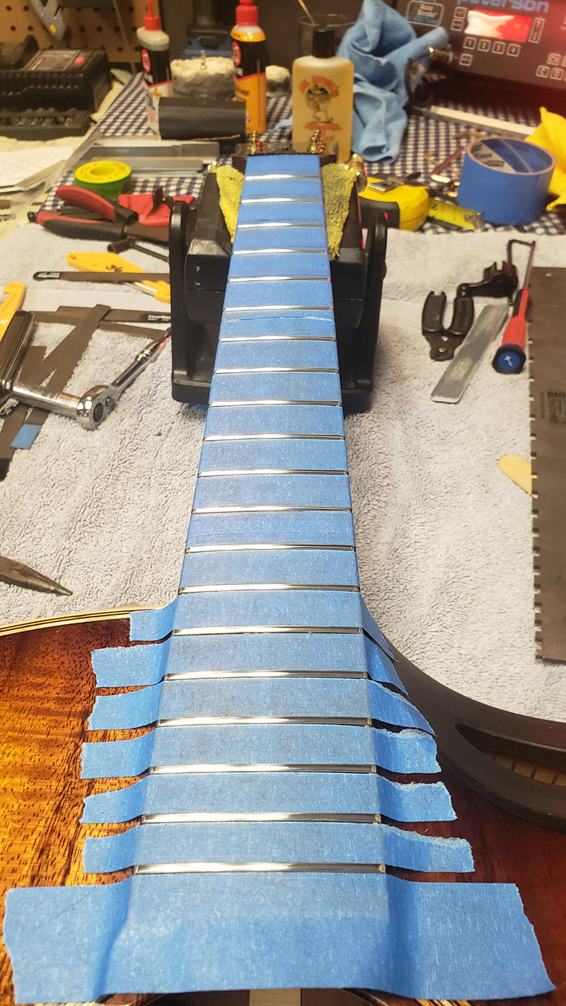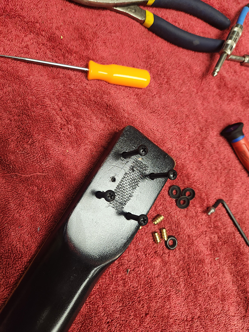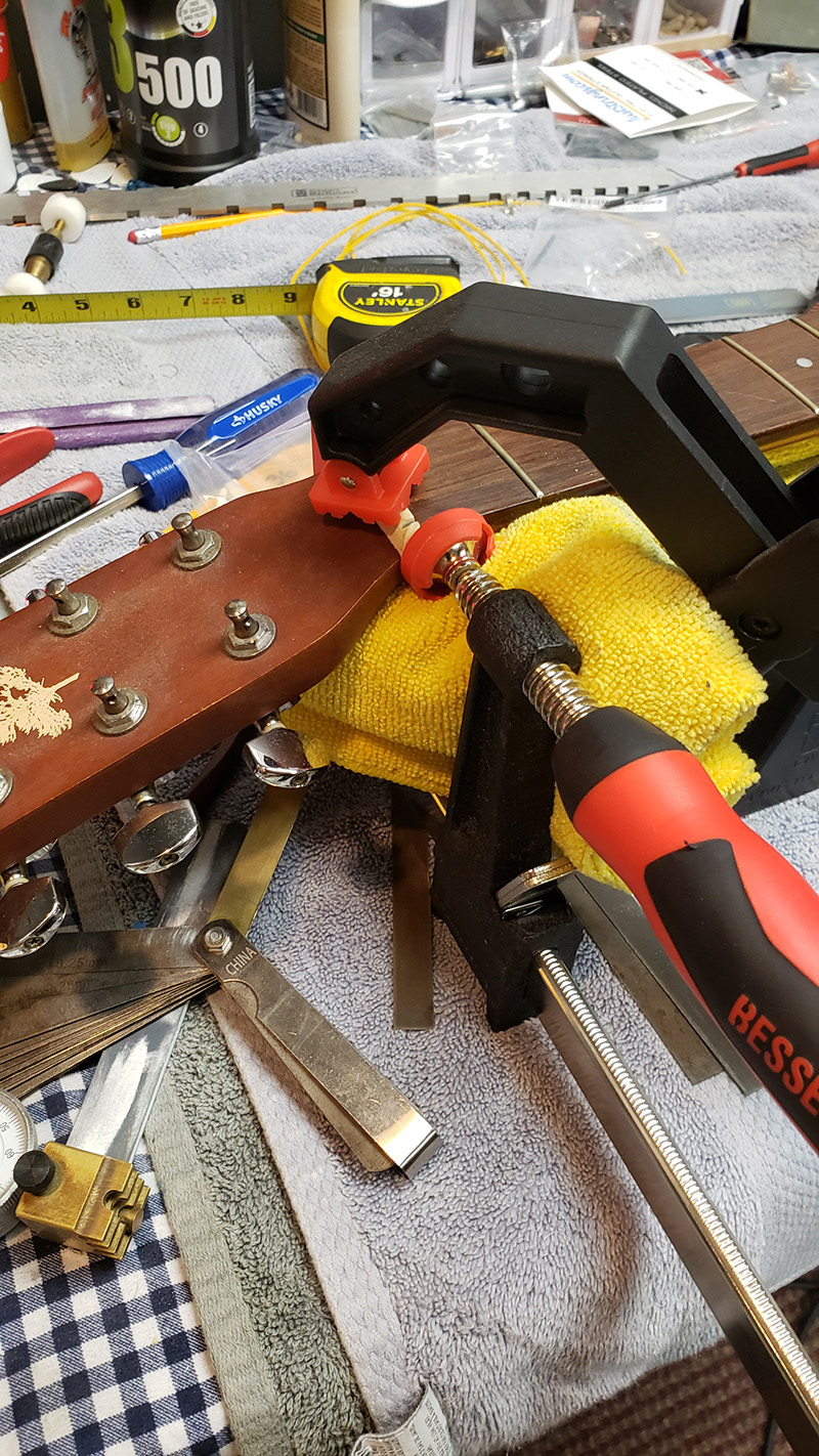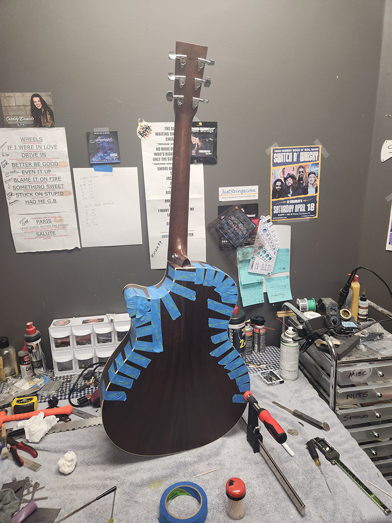 We work on every component of your guitar: necks, fretboard, frets, nuts, saddles, bridge, headstock repair, tuners, electronics, body damage, structural bracing, neck reset, binding, nitrocellulose and poly finishes, oil finishes, and fretless bass.